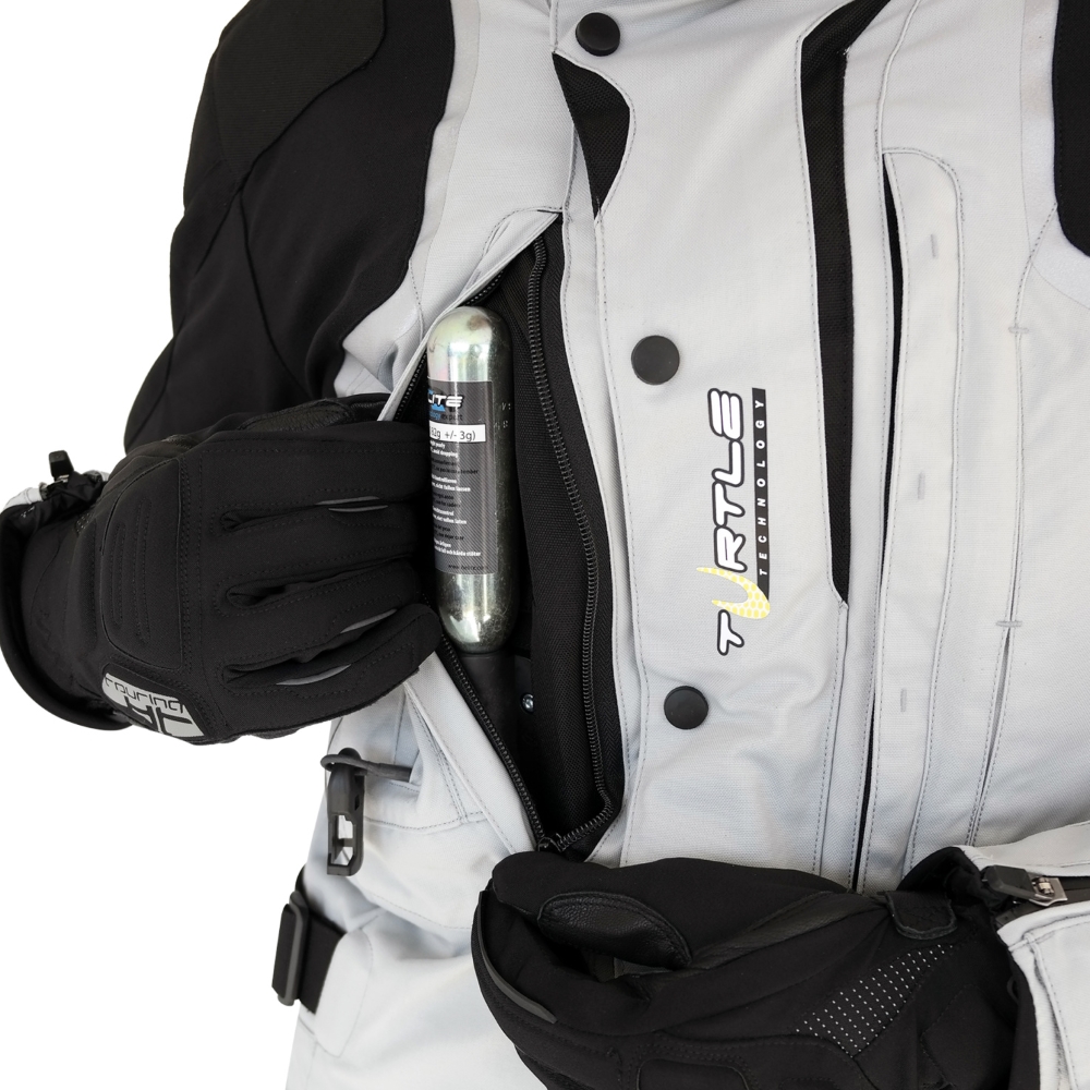 K tomu je ještě bunda vybavena zádovým protektorem, který působí jako želví krunýř. To má za následek odolnost proti protržení a plné rozptýlení síly na povrchu. Avšak samotný airbag je chytře integrován tak, že bunda vypadá jako klasická motocyklová textilní bunda.