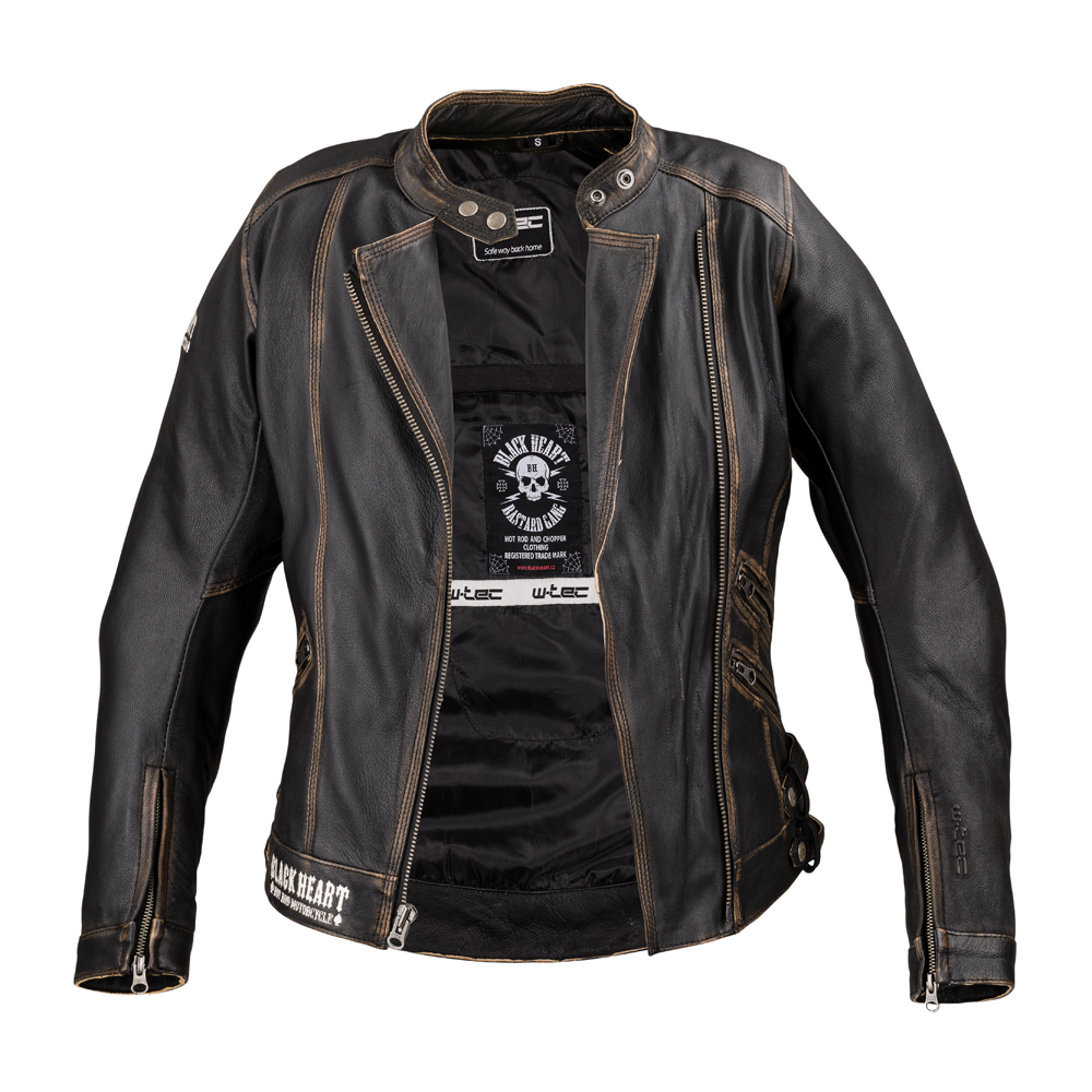 V klasickém stylu "křiváku", měkká a poddajná kozí kůže, vintage vzhled, šité nápisy Black Heart.. Dámská kožená moto bunda W-TEC Black Heart Lizza dominuje klasickým střihem takzvaného "křiváku". Výrazným prvkem je pro tento typ bundy totiž typické hlavní zapínání, které není umístěno do jejího středu. Vkusný vzhled ještě doplňuje trendy obnošeným stylem.