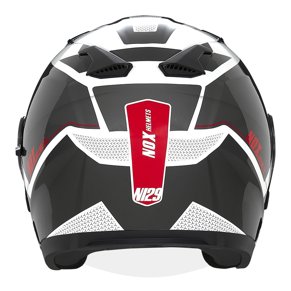 ECE 22.06, prostor pro sluchátka Bluetooth komunikátoru, příprava pro Pinlock® folii, atraktivní grafika.. Moto přilba NOX N129 je oblíbená otevřená helma s plexi i sluneční clonou a navazuje na skvělé vlastnosti své předchůdkyně N128. Je tvořena polykarbonátovou skořepinou s použitím vysoce odolných materiálů. Dále potěší i prostor pro sluchátka Bluetooth komunikátoru nebo příprava pro Pinlock® folii omezující zamlžování. Plně odnímatelná komfortní výstelka je pratelná. Zapínání je provedeno pomocí snadno ovladatelné mikrometrické přezky. Verze Triom navíc přináší atraktivní grafiku.Technický popis: