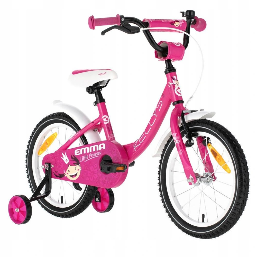 Kolo EMMA je vybaveno řadou bezpečnostních prvků jako jsou blatníky, odrazky či plastový kryt, který chrání nohu před řetězem. Rám kola je konstruován tak, aby se dítěti snadno a bezpečně nasedalo a sesedalo, zároveň ale nekoliduje s plastovým krytem řetězu. Z barevných kombinací, tedy růžové a bledě modré, si vybere každá malá dívka. Atraktivitu kola zvyšuje také barevně potištěné sedlo. Postranní pomocná kolečka ladí s celkovým barevným provedením, takže je vše dokonale sladěno do jednotného designu.