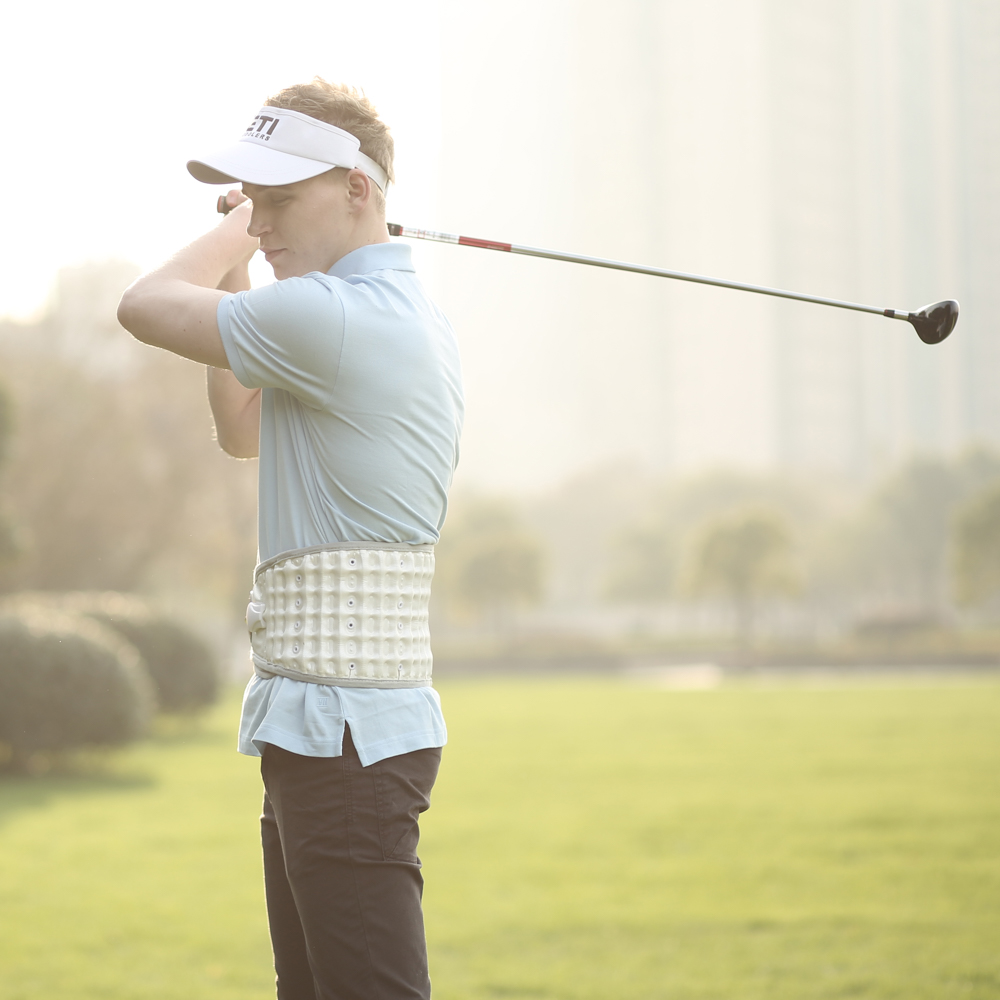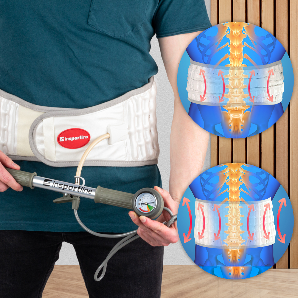 Pás se nafukuje pomocí ruční pumpičky a záleží pouze na vás, jaký maximální tlak zvolíte. Při nafukování se rozpíná směrem nahoru a uvolňuje tak obratle i ploténky. Díky integrovanému tlakoměru si pak můžete výsledný tlak zaznamenat a řídit se touto hodnotou při příštím použití. Výhodou je také zúžení přední části pásu, protože vás pak nijak neomezuje v pohybu. Můžete se tak věnovat jakýmkoliv aktivitám včetně sportu!
