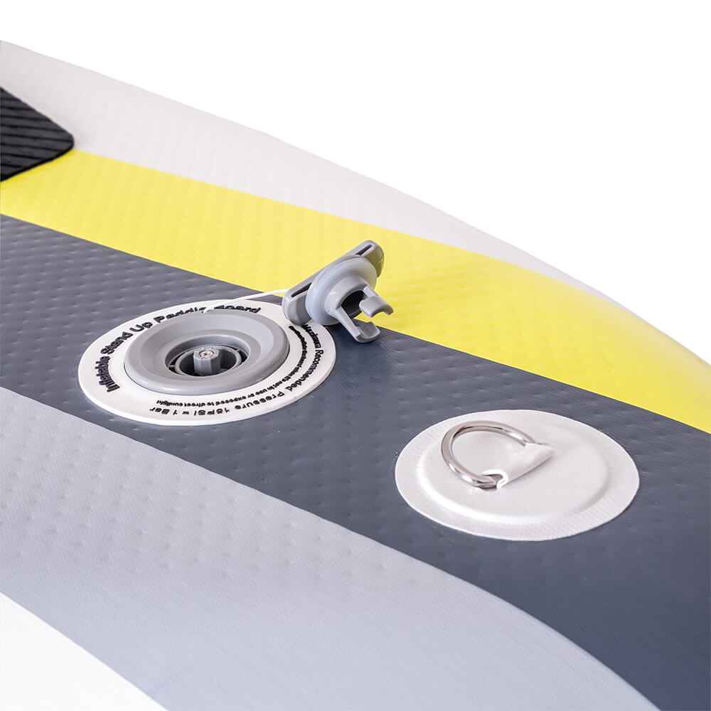 Paddleboard také disponuje spoustou doplňků a vychytávek, které zpříjemní pádlování i jeho přenášení. Pod elastické bungee šňůry upevníte lehký náklad, který nechcete nechávat na břehu. Protiskluzová EVA podložka na horní straně pak zajistí maximální grip a minimalizuje riziko uklouznutí. Ale pokud byste přece jen upadli, není to žádná tragédie. K noze a nerezovému D-kroužku si připevníte bezpečnostní leash a paddleboard vám tak nikam neuplave. Pro přenášení je tu pak pevné madlo uprostřed.