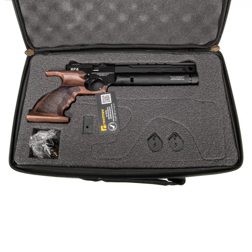 Vzduchová PCP pistole s dřevěnou pažbou a dlouhou hlavní pro přesnou střelu na terč. Disponuje 2 zásobníky a duralovou kartuší na 50 cc.. Rerimex RPA W 4,5 mm je kompaktní PCP pistole s krásnou dřevěnou pažbou, skvělá pro přesnou střelbu na terč. Slouží jí k tomu dlouhá 200mm hlaveň a regulátor tlaku, se kterým dosáhnete výborné konzistence střelby. Balení najdete také adaptér pro moderátor, pokud vám zbraň přijde příliš hlučná. Dobře se vám bude střílet také díky sportovní spoušti s manuální pojistkou.