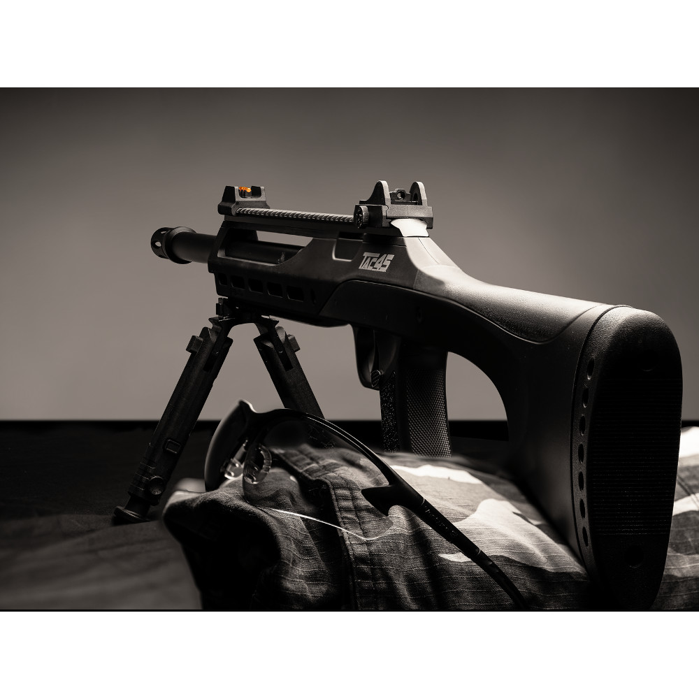 Při zamíření vám pomohou klasická pevná mířidla, je ale možné také dokoupit puškohled s montáží na 22mm lištu. Součástí balení je také dvojnožka, se kterou si zbraň pohodlně podepřete. Místo ní je možno namontovat také svítilnu.