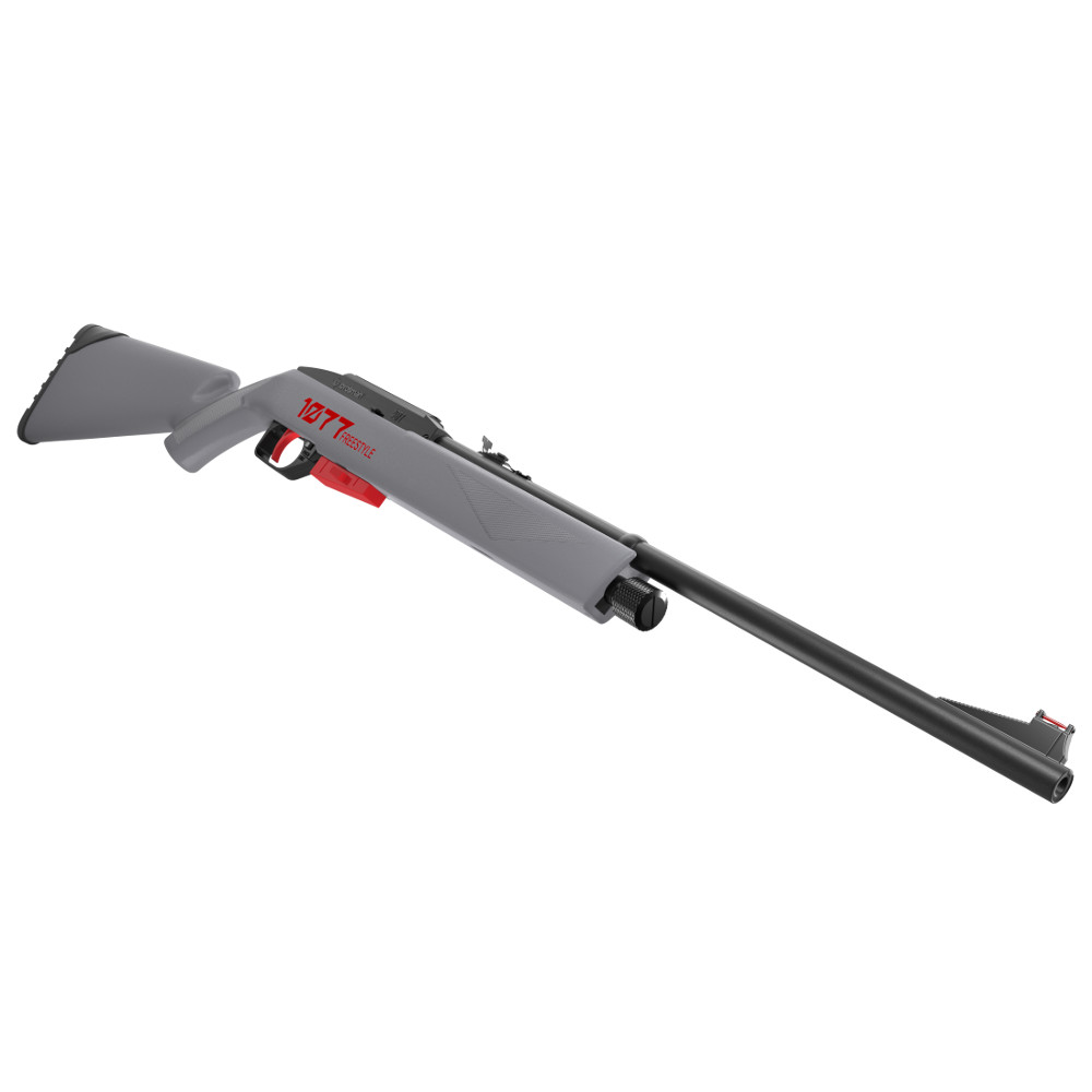Lehká poloautomatická vzduchovka poháněná CO2 s rotačním zásobníkem na diabolky.. Crossman FreeStyle Gray 1077 je spolehlivá vzduchová puška na CO2 bombičky, tentokrát v šedém provedení a dvěma kovovými terči v balení. Díky poloautomatickému provedení a 12místnému zásobníku s ní můžete pálit tak rychle, jak stačíte tlačit na spoušť – vyprázdnit zásobník se tak expertům podaří i za méně než 5 vteřin. Lehká polymerová pažba v elegantním designu s drážkováním vydrží dlouhodobé využití. Vzduchovka také disponuje plně nastavitelným hledí a muškou s optickým vláknem.