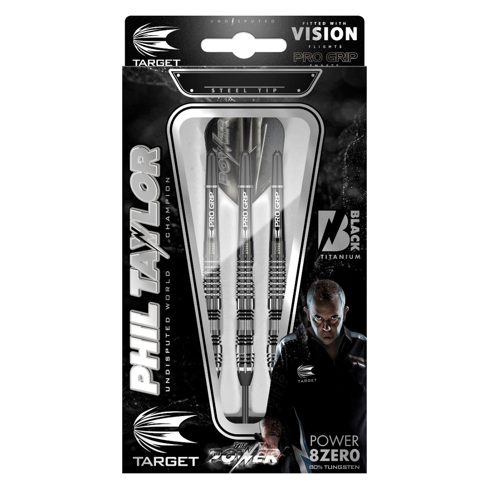 Designové wolframové šipky s pevným hrotem a unikátním gripem!. Phil Taylor Power 8-Zero Black P8Z4 jsou odolné wolframové šipky v exkluzivním designu inspirovaném legendárním hráčem Philem Taylorem! Díky unikátnímu gripu a stylovému provedení budete skvěle vybaveni na intenzivní hru. Skvělé letové vlastnosti pak zajišťují násadky Pro Grip a letky Vision.Technický popis: