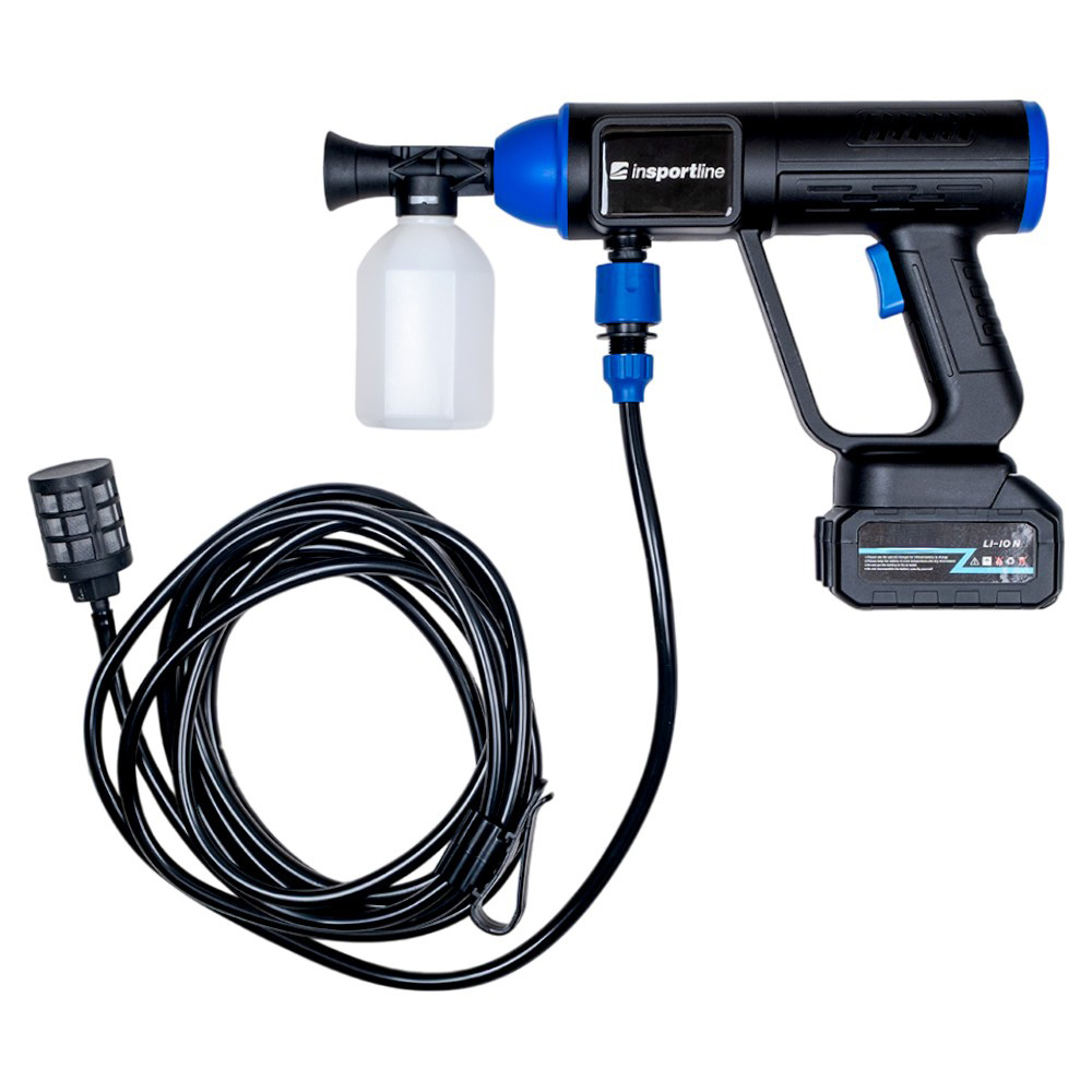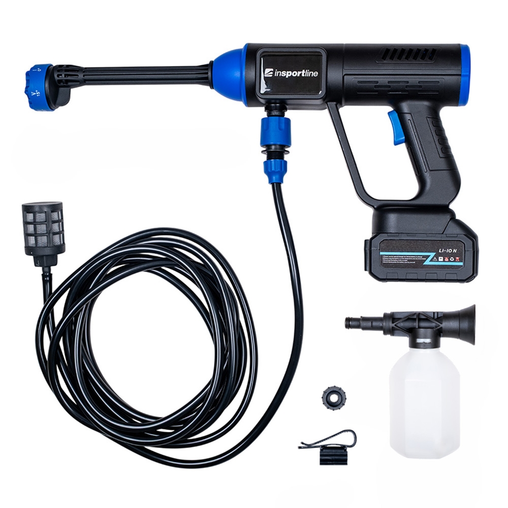 Výkonná 21V akumulátorová mycí pistole s tlakem 35 bar a průtokem 6 l/min. Bezdrátová, s bohatým příslušenstvím – ideální na kolo, auto i zahradu doma i na cestách.. Akumulátorová mycí pistole inSPORTline Esedera je praktický a výkonný pomocník pro rychlé a pohodlné čištění doma i na cestách. Díky bezdrátovému provozu a silné 21V baterii s kapacitou 3000 mAh nabízí maximální volnost pohybu bez nutnosti připojení k elektrické síti. S výkonem motoru 300 W, maximálním tlakem 35 bar a průtokem vody až 6 l/min si snadno poradí s běžnými nečistotami na kolech, elektrokolech, automobilech, motorkách i zahradním vybavení.