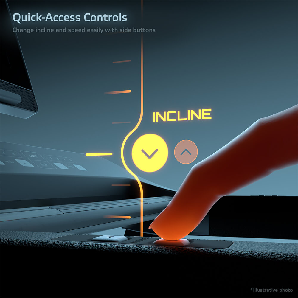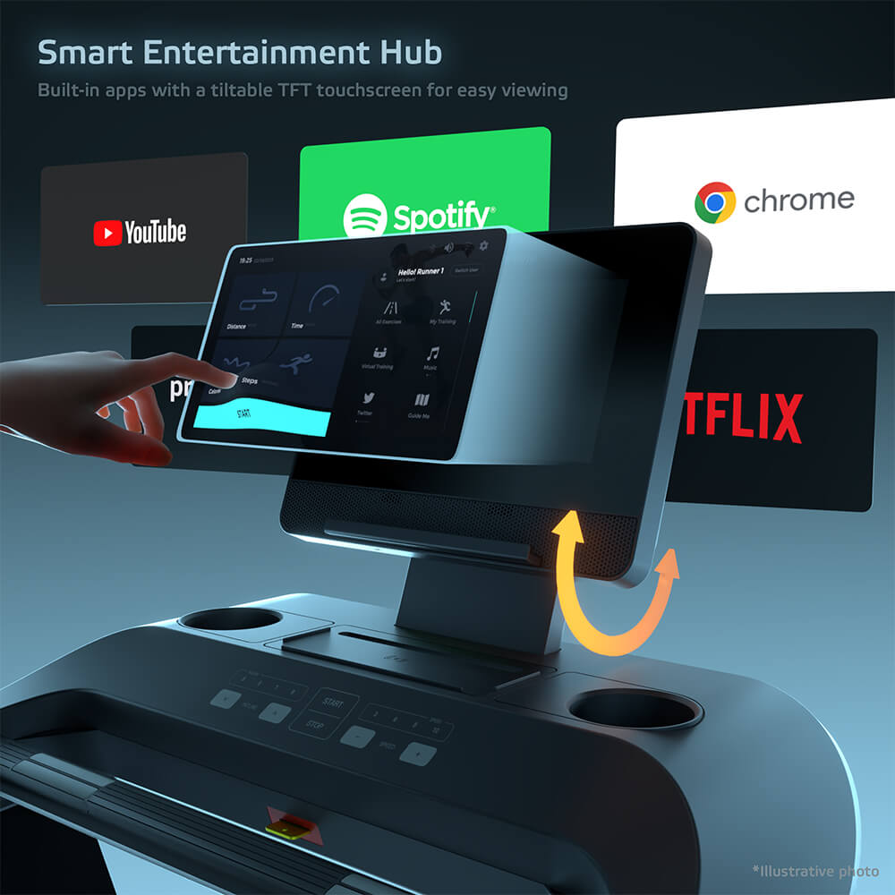 Na první pohled Vás zaujme 15,6″ dotykový TFT displej, který se postará nejen o přehledný přehled všech tréninkových údajů, ale i o zábavu během cvičení. Předinstalované aplikace jako YouTube, Netflix, Spotify, Facebook, Chrome či Prime Video zpříjemní každou minutu na pásu. Samozřejmostí je Bluetooth propojení s telefonem a bezdrátové i USB dobíjení a Touch a Run ovládání na madlech pro rychlé úpravy sklonu i rychlosti.