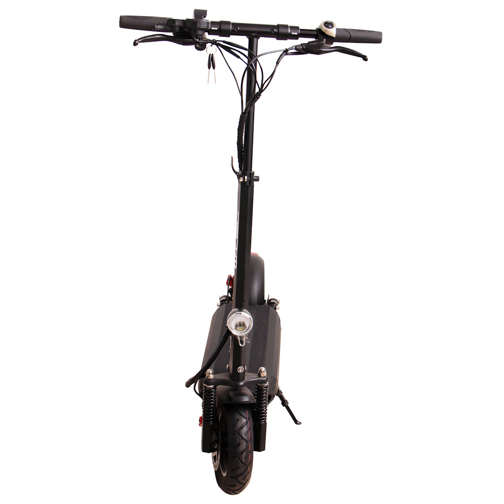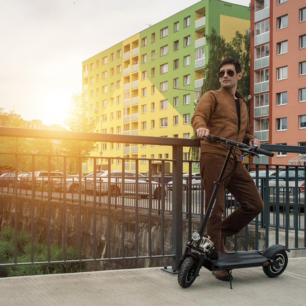 Na pečlivém zpracování, které bylo vyšperkováno do detailu, se podílí také pevné pneumatiky s průměrem 10″ (25,4 cm), jež mají skvělou přilnavost a výborně tlumí nepříjemné vibrace při jízdě. Koloběžka navíc disponuje kvalitním předním a zadním odpružením, které zaručuje pohodlnou a hladkou jízdu. Kromě toho jsou kola chráněna blatníky, což přispívá k ochraně před nečistotami z důvodu nepříznivého počasí. Odolnosti napomáhá i samotná hliníková konstrukce s výškově nastavitelnými řídítky. Koloběžka bude vhodná pro jezdce s postavou od 150 do 210 cm. Na 53 cm dlouhém nášlapu se můžete pohodlně svést s chodidly za sebou či vedle sebe.