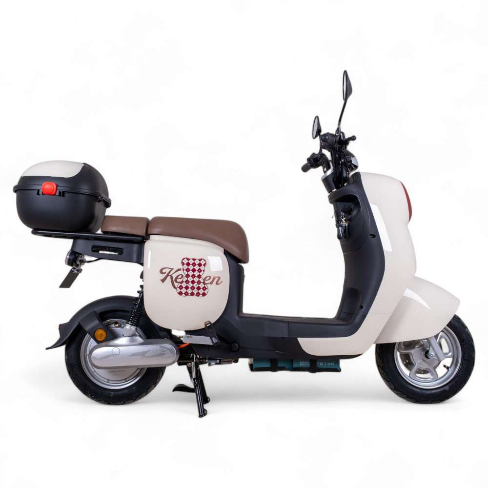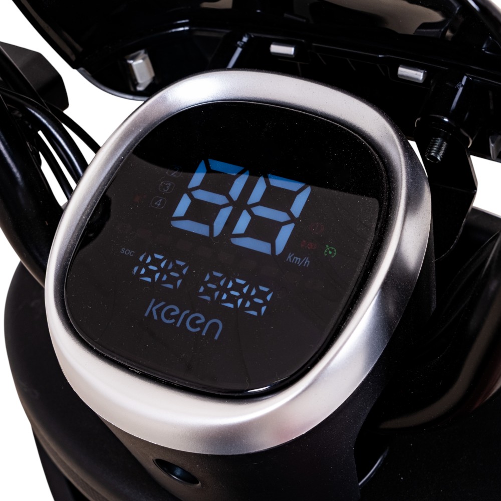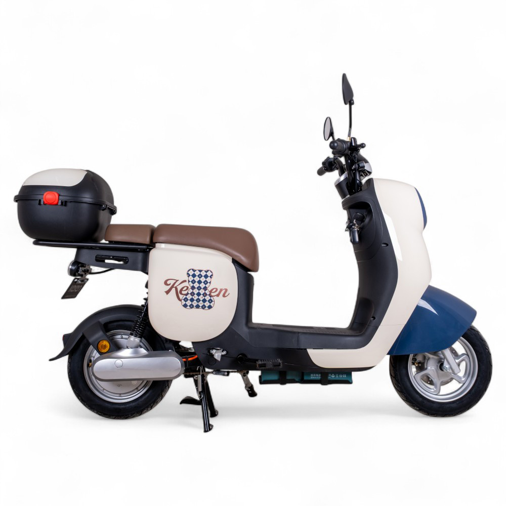 Na první pohled retro, ale výbavou úplně jinde. Komfortní sedlo, prostor pro nohy i stupačky pro spolujezdce, USB port na nabíjení telefonu, tempomat, LED světla i dálkové ovládání s alarmem. Keren Beike 10″ má šlapací pedály, takže pokud vám cestou z výletu dojde šťáva, tlačit ho rozhodně nemusíte.