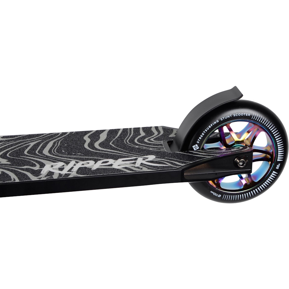 Široký nášlap, pevná ocelová řídítka, HIC kompresní systém a 4-bodová objímka pro maximální stabilitu při tricích.. Freestyle koloběžka Street Surfing RIPPER zaujme precizním zpracováním, robustní konstrukcí a jedinečným designem s CNC výřezem.
