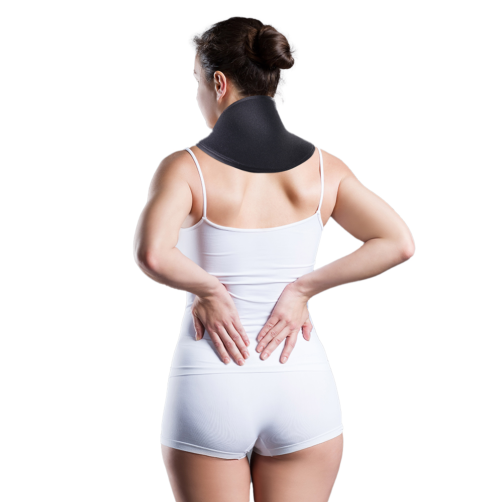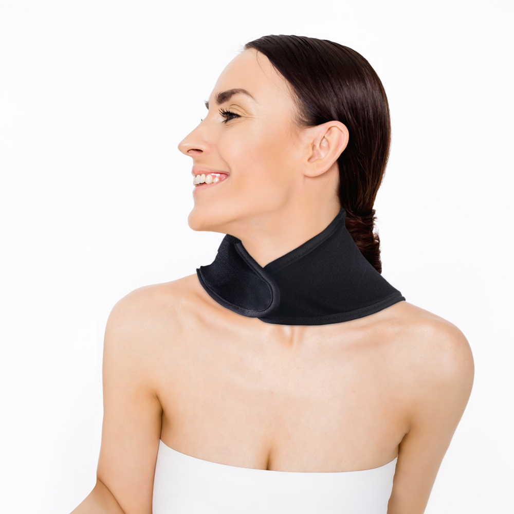 Polštářek lze umístit kolem ramen a krku pomocí suchého zipu. Díky svým rozměrům zahalí krk téměř celý.