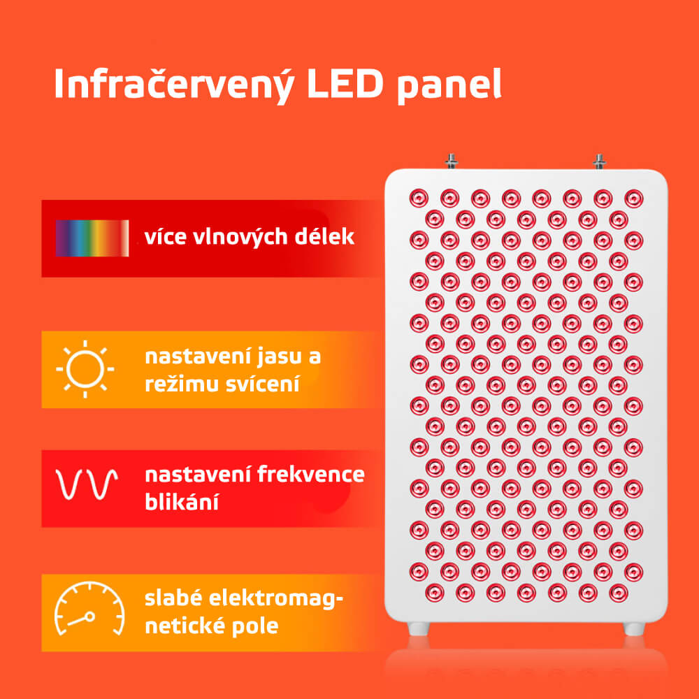 ? Infračervené světlo (IR) jako celek prohřívá svaly a prostupuje nejhlouběji do těla. Velice efektivně působí na prokrvení a uvolnění svalů i kloubů. Infračervené světlo není viditelné a nejlepšího efektu dosáhneš v infrasauně! Panel produkuje pouze blízké infračervené světlo.