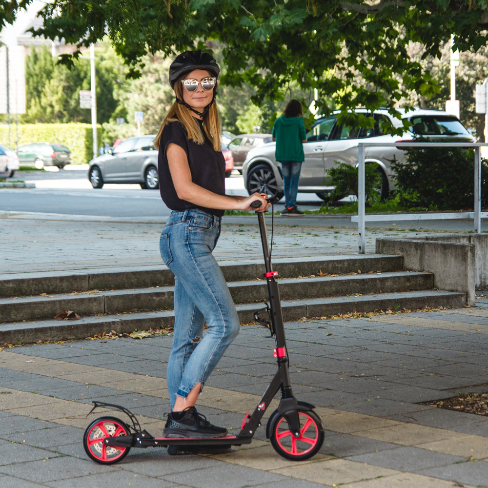 Díky systému odpružení a silné přední vidlici zvládne i zajížďky na horší povrchy a jízda je i na nich pohodlnější. Nastavitelná výška řídítek a 230/200 mm kolečka vhodná především pro jízdu po asfaltu doplňují příjemné a svižné jízdní vlastnosti koloběžky a vysoký stupeň komfortu.
