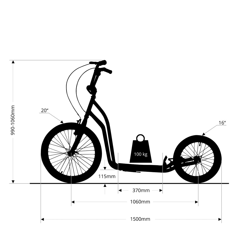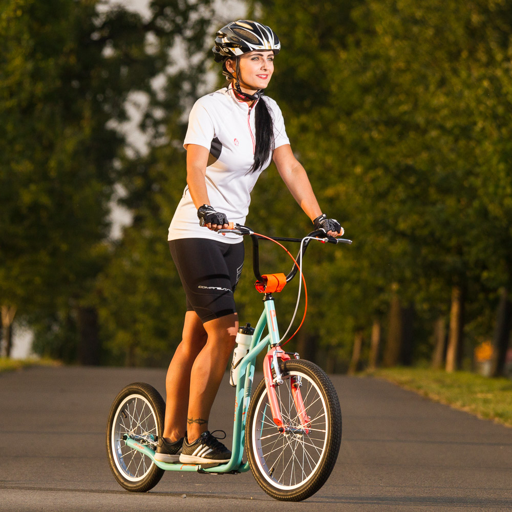 Koloběžku tak lze používat jak na asfaltu ve městě či cyklostezkách, tak například na polních cestách a v mírném terénu. Celá koloběžka je díky své velikosti, délce a možnosti výškově nastavit řídítka vhodná především pro dospělé (cca od 155 do 195 cm výšky).