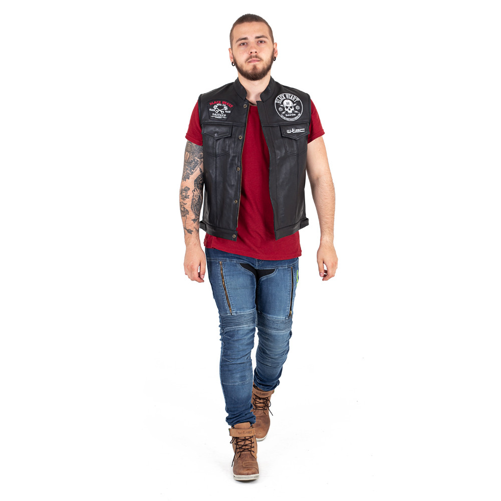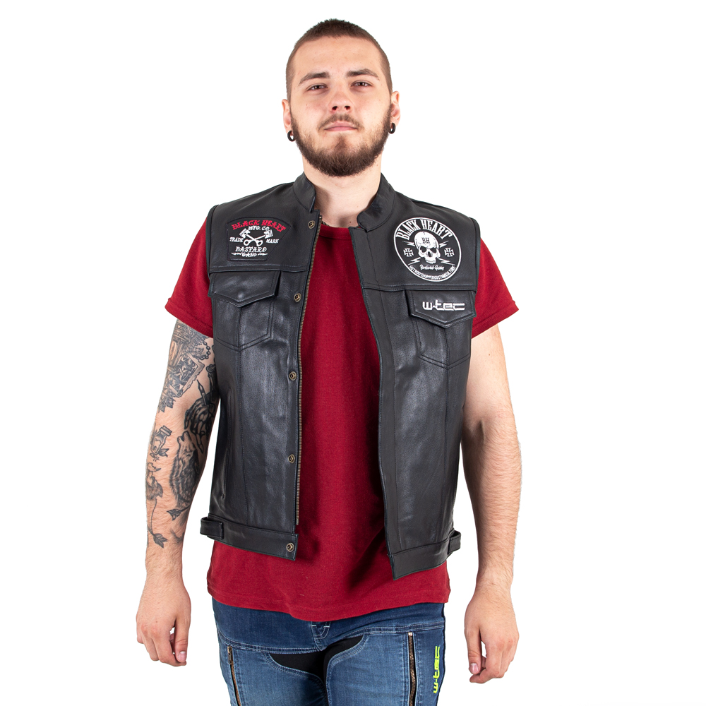 Kožená vesta s motorkářskými motivy a nášivkami, zapínání na zipy a druky, 6 kapes.. Moto vesta W-TEC Rumbler je atraktivní kožené oblečení vhodné pro jízdu na motorkách, ale je skvělá také na běžné nošení. Na jejím originálním grafickém zpracování se značka W-TEC spojila s českým progresivním designérským brandem Black Heart. Motorkářské nášivky tady tvrdí muziku! Celá stylovost je zvýrazněna velkým embosovaným logem na zádech. Vesta jako taková se zapíná pomocí zipu a druků. Prostor pro uložení osobních věcí je rozdělen do šesti kapes. Dvě kapsy pro úschovu cenností nebo dokladů se nachází na vnitřní straně vesty (jedna je jištěná zipem), zatímco ještě další dvě kapsy najdete z vnější strany na bocích. Ve finále lze ještě použít kapsičky na hrudi.Technický popis: