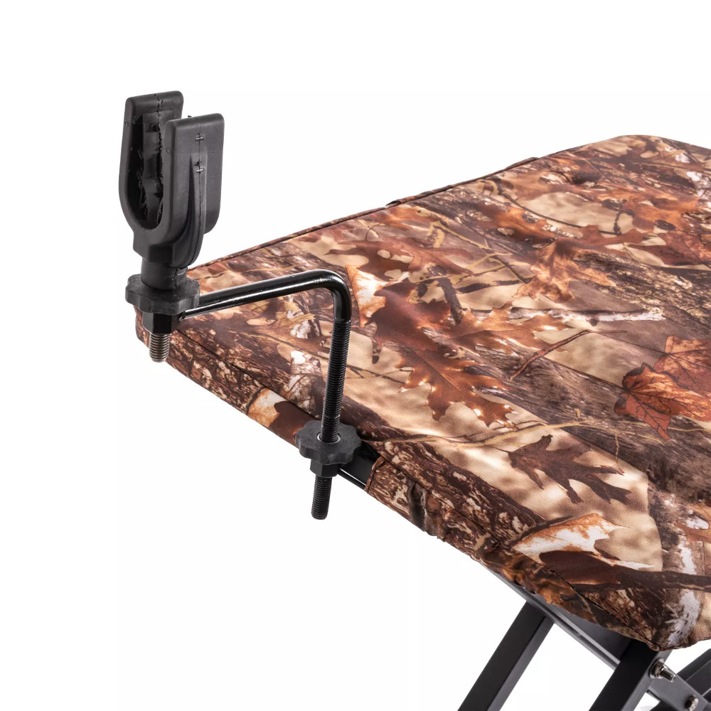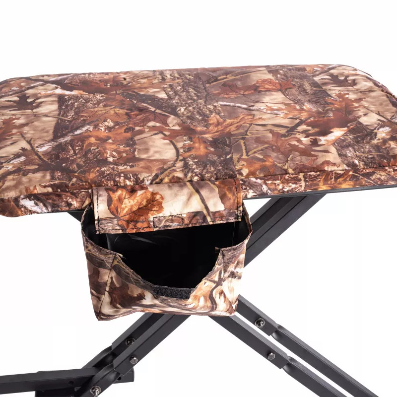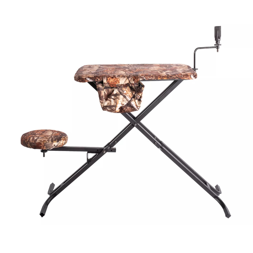 Součástí soupravy je také jednoduchý sedák, který lze dle potřeby nastavit vertikálně i horizontálně. Sedák i povrch stolu jsou pokryty pohodlným polstrováním. Stůl váží 11,7 kg a je vyroben v maskáčovém designu, aby vás ve volné přírodě nebylo vidět. Technický popis:
