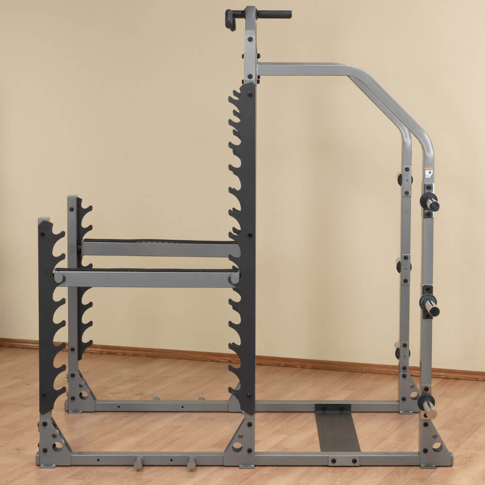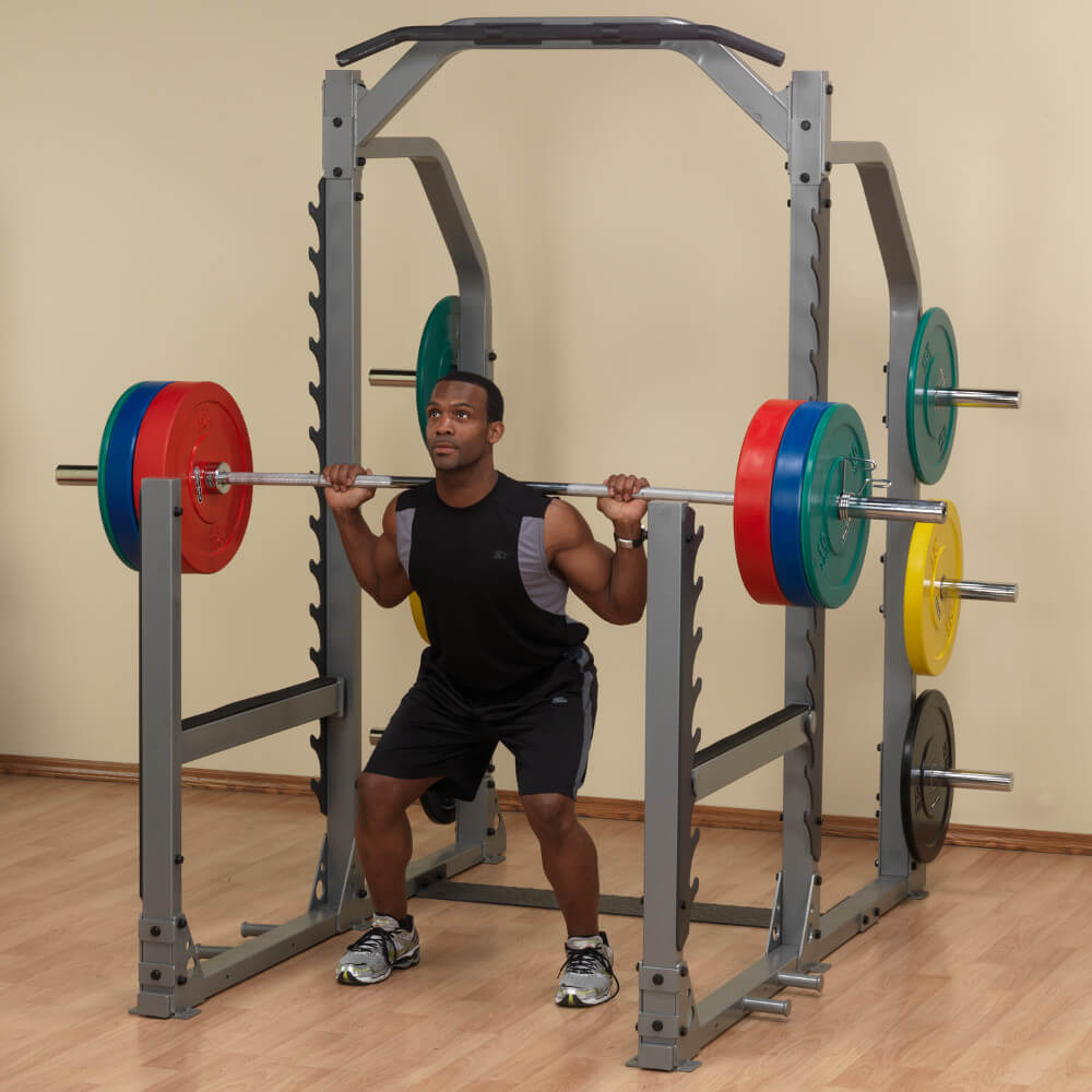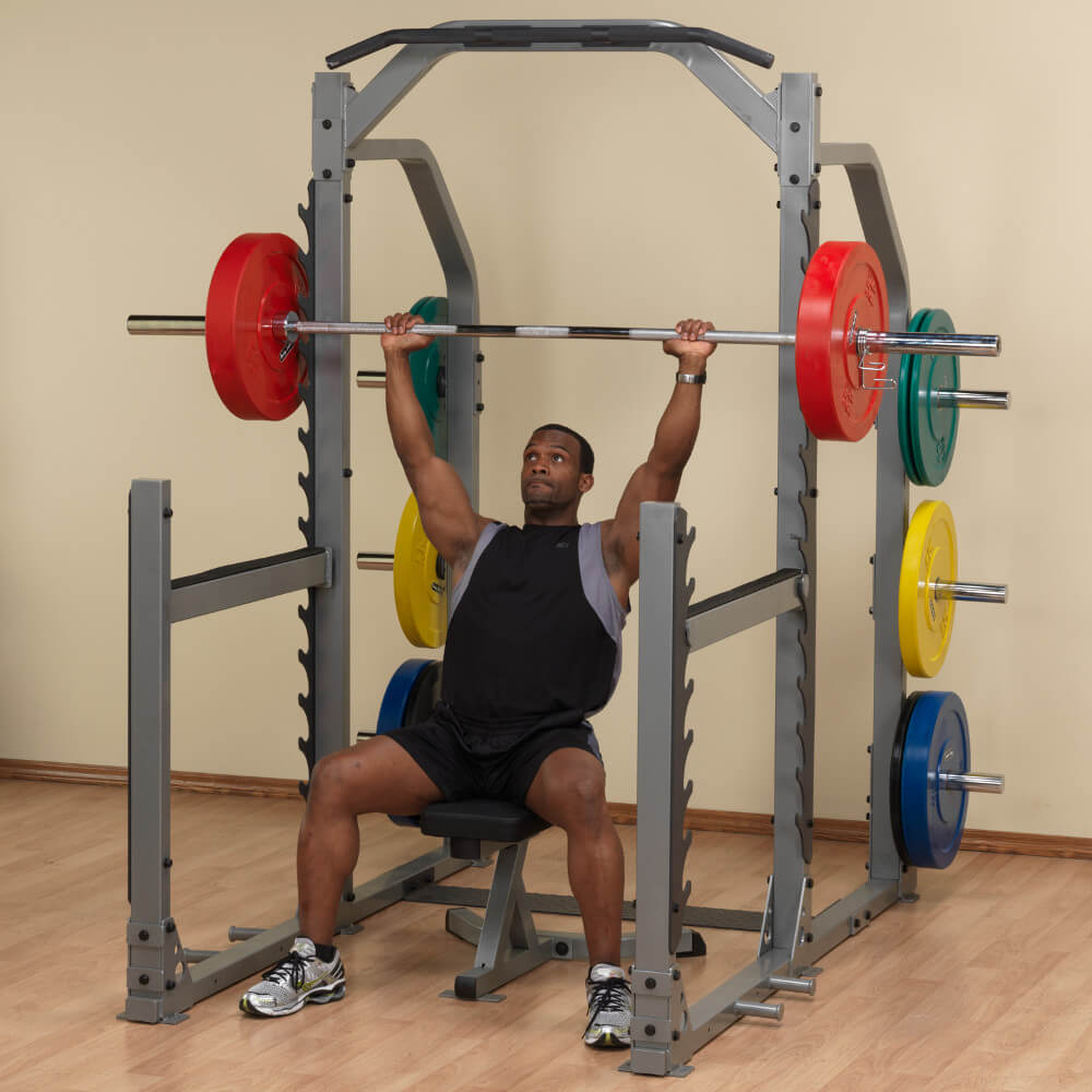 Profesionální posilovací stojan pro pohodlný trénink i se spotterem! Nastavitelné jistící tyče unesou až 450 kg!. Body-Solid SMR1000 je masivní posilovací stojan pro všestrannou a hlavně bezpečnou práci s činkami! V domácím i profesionálním prostředí vám poskytne pohodlný prostor pro trénink a vytváří místo jak pro cvičícího, tak pro spottera, který ho při zdvihu činek jistí. Díky polohovatelným jistícím tyčím navíc můžete začít trénink i z vyšší polohy, což je vhodné zejména pro začátečníky. Zarážky unesou až 454 kg, takže se můžete propracovat k opravdu slušné váze!