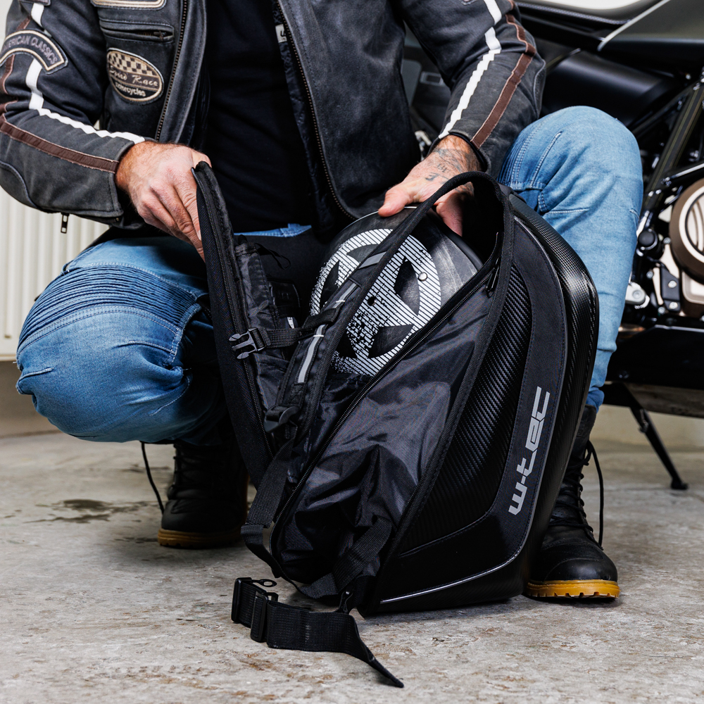 Tuhý batoh s aerodynamickým tvarem a karbonovým vzhledem, prostor pro helmu po rozšíření pomocí zipu, pláštěnka.. Skořepinový batoh W-TEC Shellter je promyšlené zavazadlo ideální především pro použití na motocyklech. Díky tuhé skořepině a otěruvzdorné vnější tkanině je batoh odolný i vůči tvrdšímu zacházení. Zároveň tak drží svůj aerodynamický tvar, podobně jako hrb závodního jezdce, a na zádech vytváří jakýsi „krunýř“. Samozřejmě se myslí i na celkovou praktičnost, a proto jej lze při sesednutí z motocyklu rozšířit pomocí zipů, a tak do něj vložíte i celou moto přilbu.